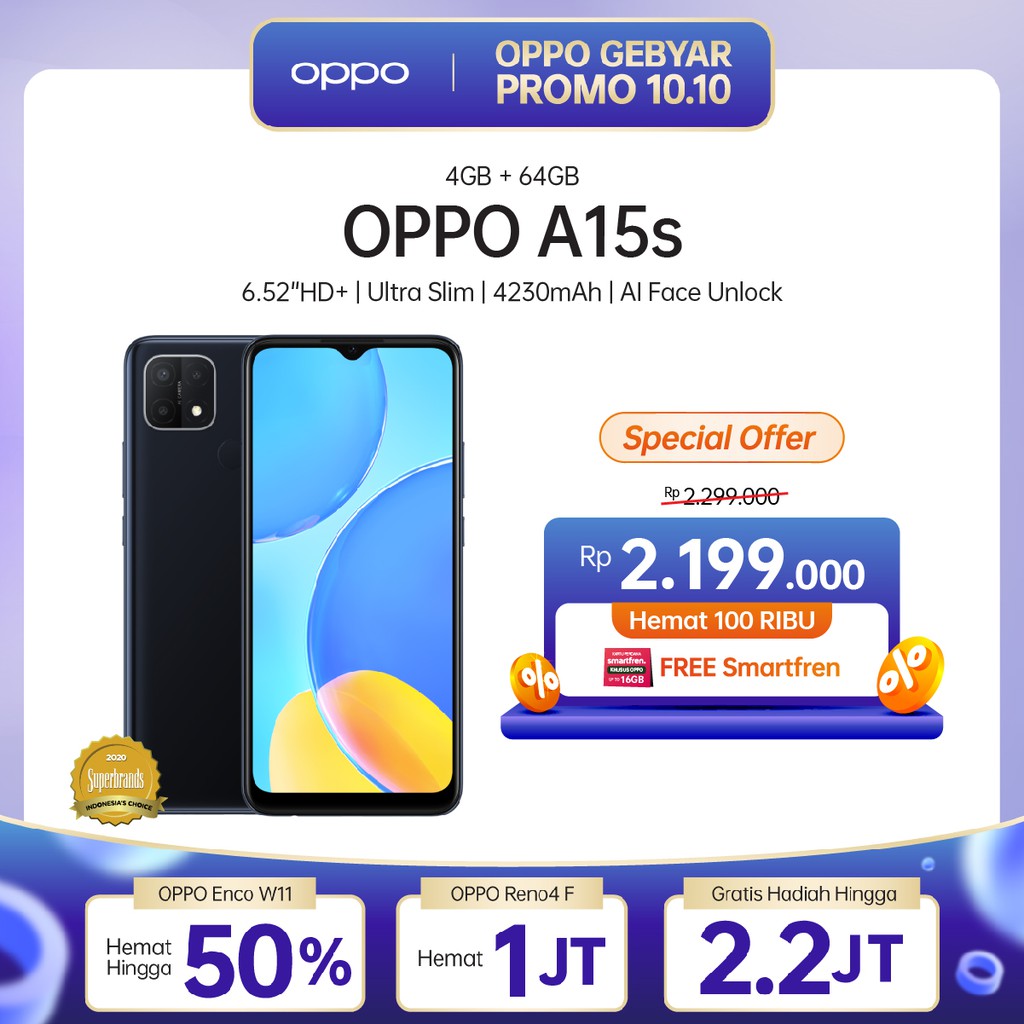 Produk OPPO A15S 4GB/64GB [4230 mAh, AI Face Unlock] ini harganya adalah Rp. 2.199.000,00 dan saat ini sedang Diskon 4%, Produk ini sendiri saat saya tulis Artikel ini sudah dilihat sebanyak 96282 kali dan sudah disukai sebanyak 7184 kali.