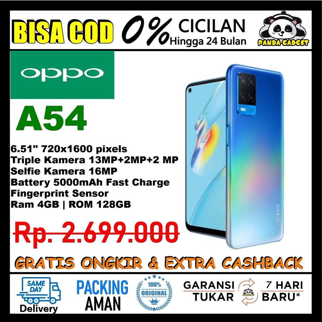 Produk OPPO A54 RESMI Indonesia | A 54 Black Blue Ram 4 / 6 GB | Storage 64 / 128 GB Triple Camera ini harganya adalah Rp. 1.922.000,00 dan saat ini sedang Diskon , Produk ini sendiri saat saya tulis Artikel ini sudah dilihat sebanyak 608 kali dan sudah disukai sebanyak 12 kali.