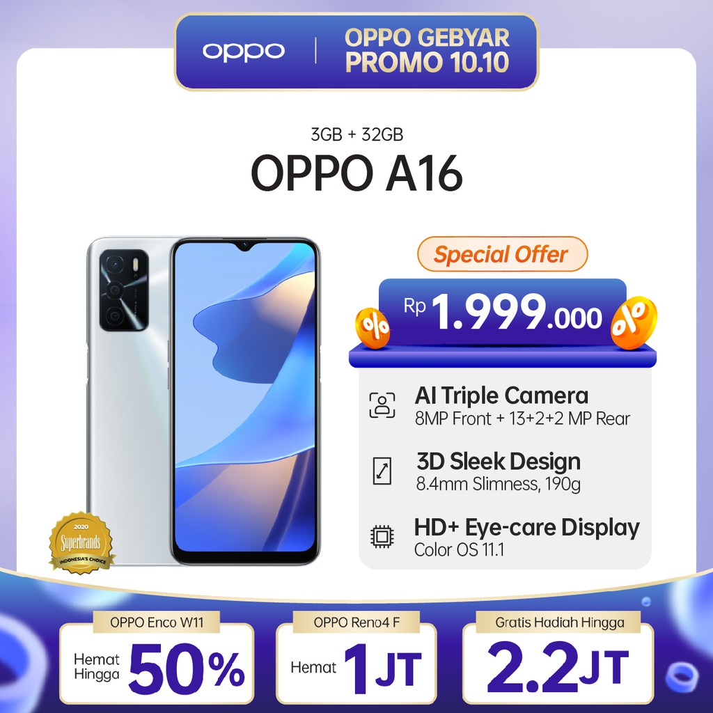 Produk OPPO A16 3GB/32GB [13MP Triple Camera, HD+ Eye-care Display, 5000mAh] ini harganya adalah Rp. 1.999.000,00 dan saat ini sedang Diskon , Produk ini sendiri saat saya tulis Artikel ini sudah dilihat sebanyak 273839 kali dan sudah disukai sebanyak 8014 kali.