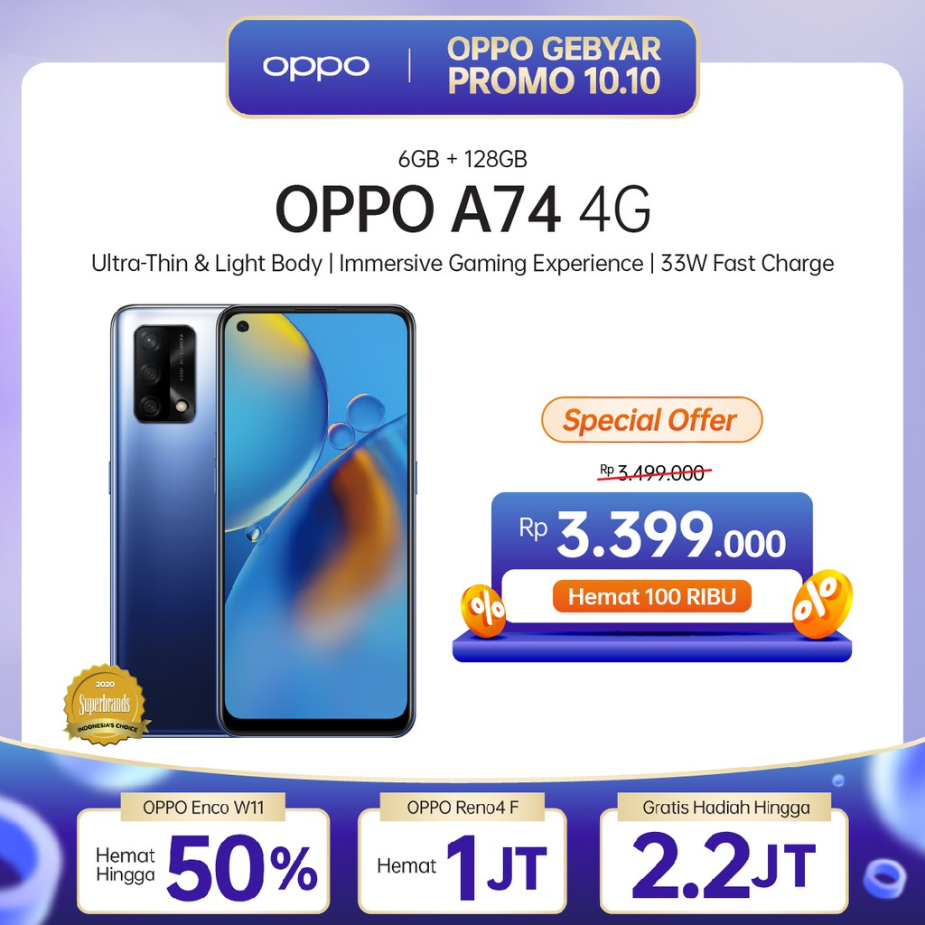 Produk OPPO A74 6GB/128GB [5000mAh, 48MP AI Triple Camera, Punch Hole AMOLED FHD+ Screen, 33W Flash Charge] ini harganya adalah Rp. 3.399.000,00 dan saat ini sedang Diskon 3%, Produk ini sendiri saat saya tulis Artikel ini sudah dilihat sebanyak 74614 kali dan sudah disukai sebanyak 3935 kali.